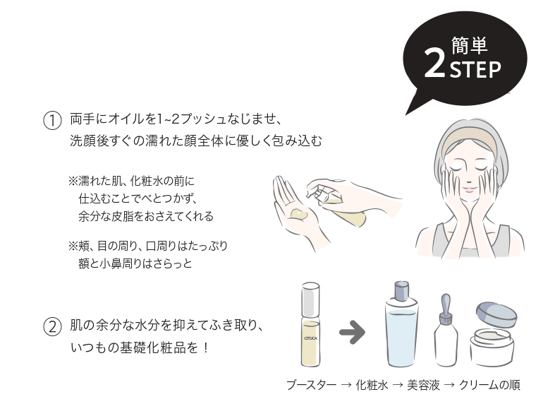 CITUCA®フェイスケアオイルを毎日のスキンケアにプラスするだけで、スキンケアの効果を底上げし、内側から輝くみずみずしい透明肌へと導きます。以下のステップで使用することをお勧めします: